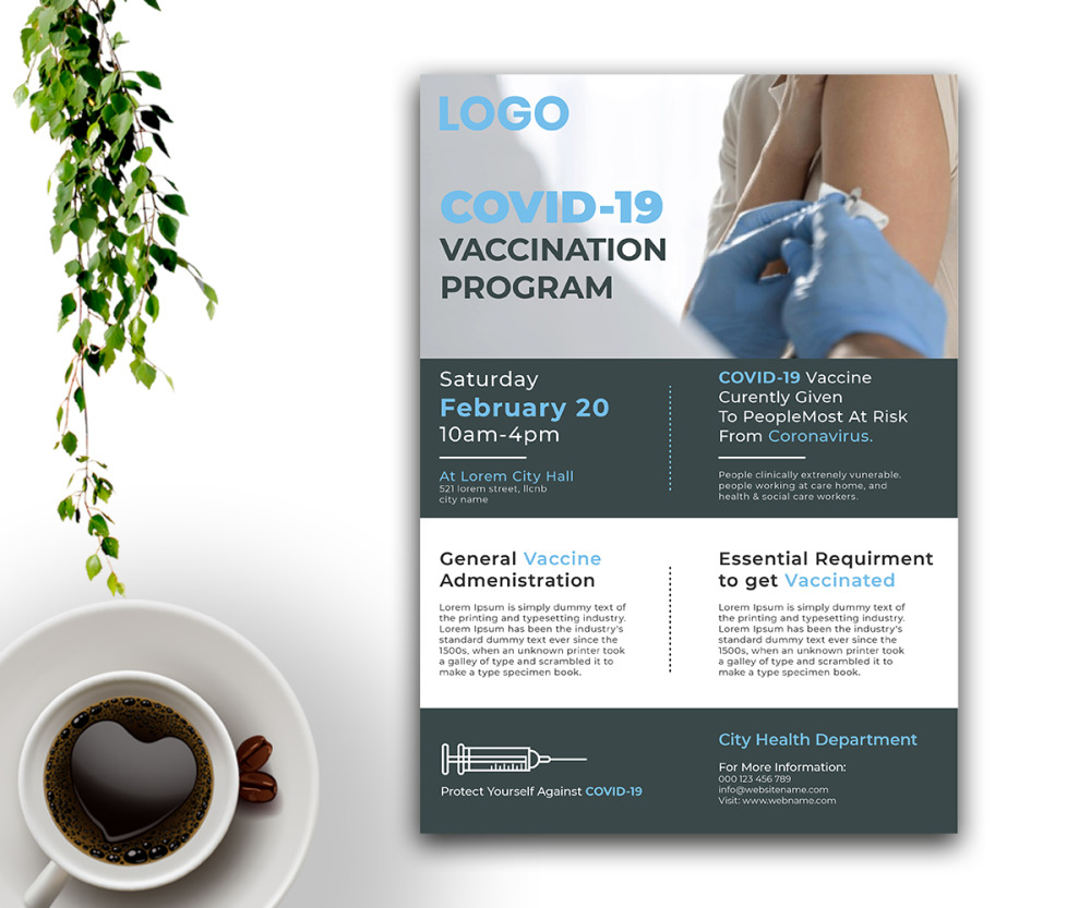 ad, advert, campaign, clinic, coronavirus, doctor, flu, flyer, health, hospital, injection, leaflet, magazine, medical, pamphlet, pandemic, poster, program, shot |