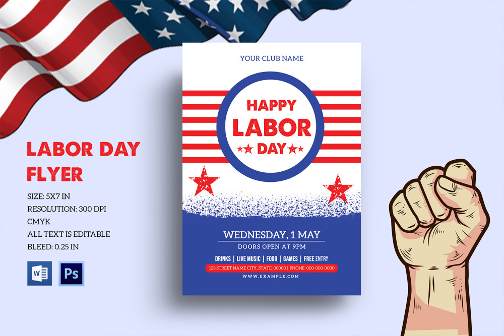 celebration, design, event, flyer, international labor day, labor day, labour day, ms word, party, photoshop, template |
