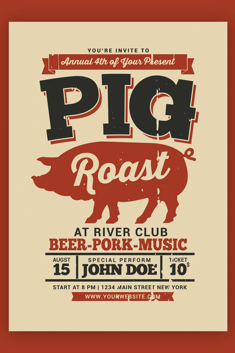 barbeque, bonfire, camp, flyer, food, grill, hoag, illustration, invitation, meat, party, pig, pork, poster, restaurant, retro, roast, vector, vintage |