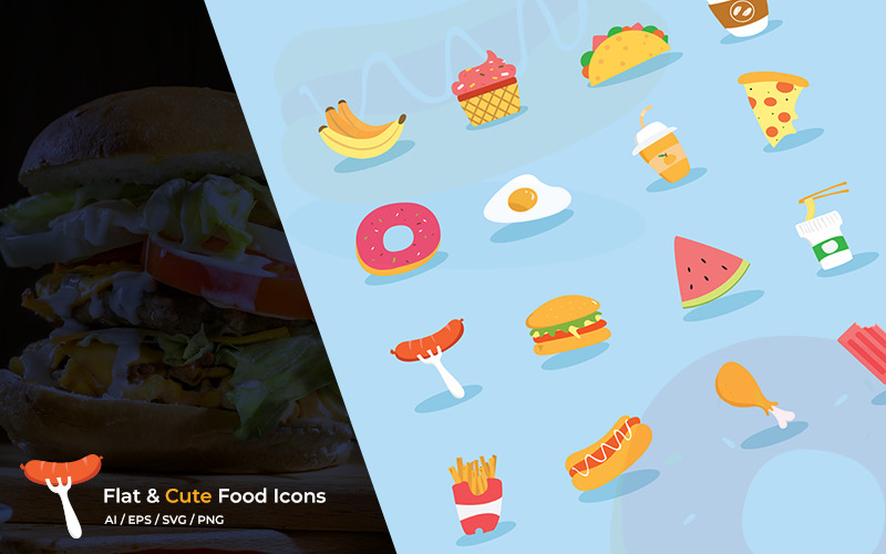 chicken legs, donuts, french fries, hamburgers, hot dogs, ice, instant noodles, lemon ice, pizza, sausage, sunny side up eggs, watermelon slices |