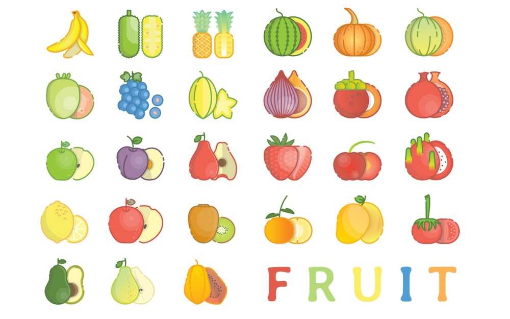 avocado, banana, cherry, coconut, dragon fruit, fruit, grape, guava, jackfruit, kiwi, lemon, mango, mangosteen, orange, papaya, pineapple, slice, strawberry |