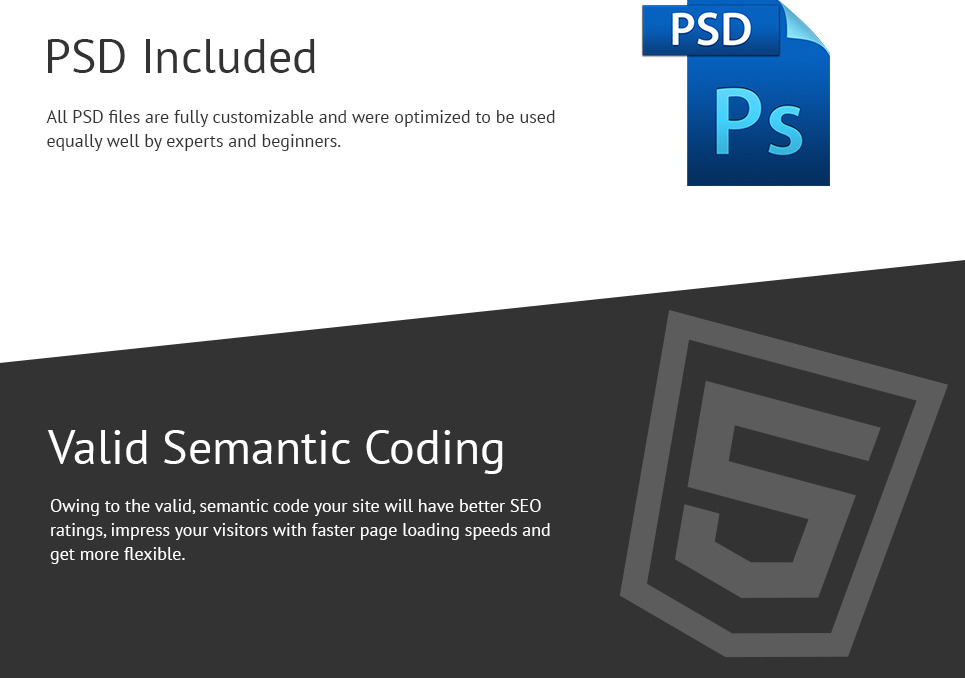 Admin Panel, Advanced Theme Options, Blog, Bootstrap, Drag and Drop Content, Dropdown Menu, Google map, HTML 5, HTML plus JS, JQuery, Portfolio, Responsive, Retina Ready, Sample content, Sliced PSD, Tabs |