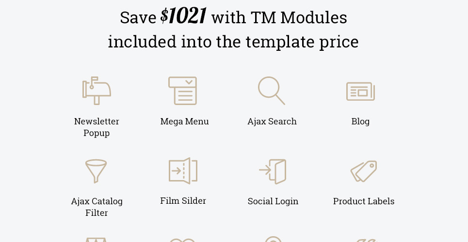 Ajax Catalog, Ajax Compare, Ajax Search, Ajax Wishlist, Blog, Custom Menu, Featured Products, Google Map, MegaMenu, Newsletter popup, Social Login, Social Sharing, Special Price Countdown, Theme Options |