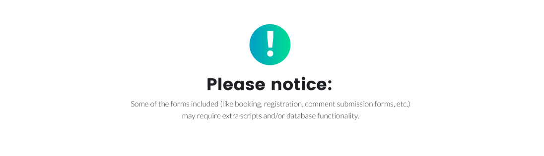 Some of the forms included (like booking, registration, comment submission forms, etc.) may require extra scripts and/or database functionality. |