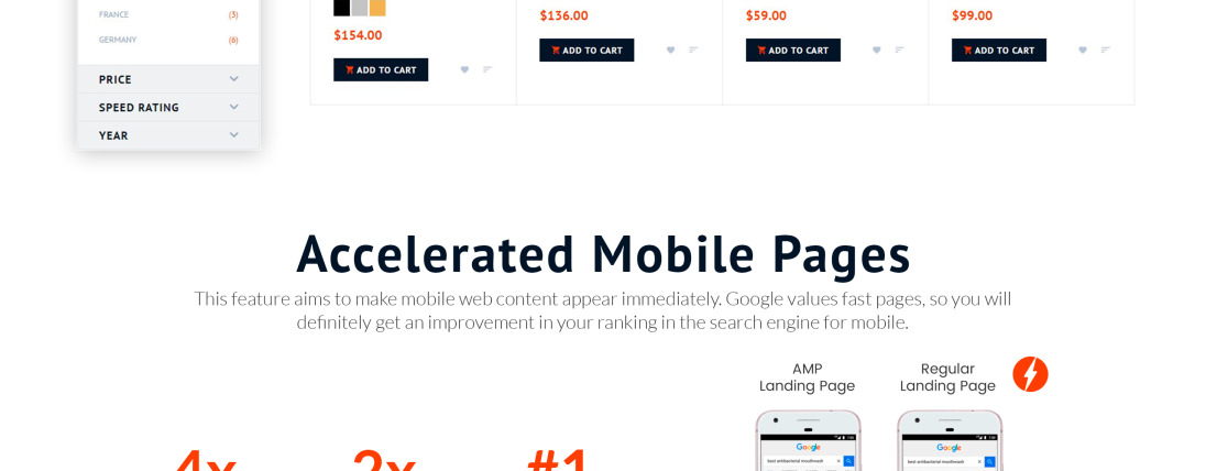 Accelerated Mobile Pages (AMP), Admin Panel, Ajax, Dropdown Menu, eCommerce, Google map, HTML 5, JQuery, MegaMenu, Mobile Layout Included, Performance Optimization, Responsive, Retina Ready, Sample content, Search Engine Friendly, Single Product, Sliced PSD |