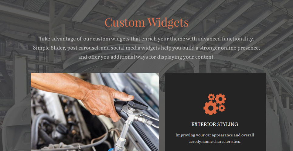 This theme is designed for car, car maintenance, car tuning, car styling, service station, garage, mechanic, service, vehicle, workshop, and, automotive repair websites. |