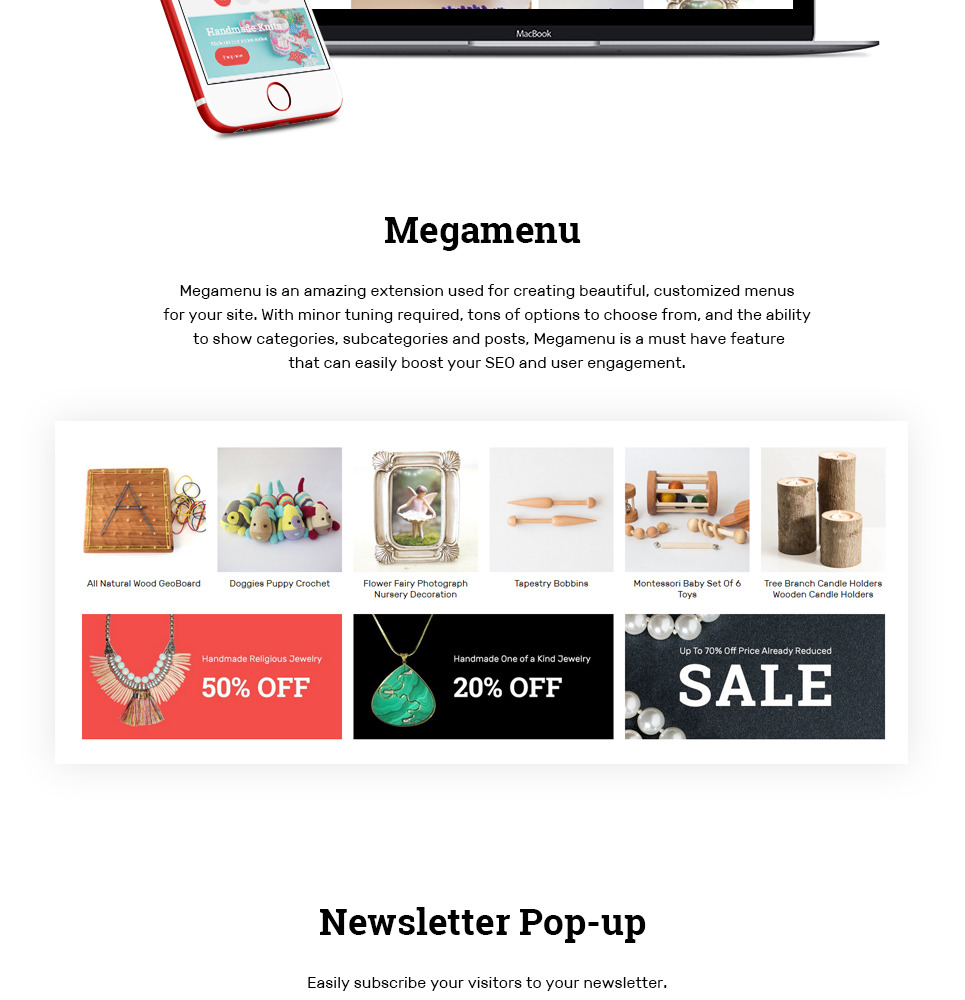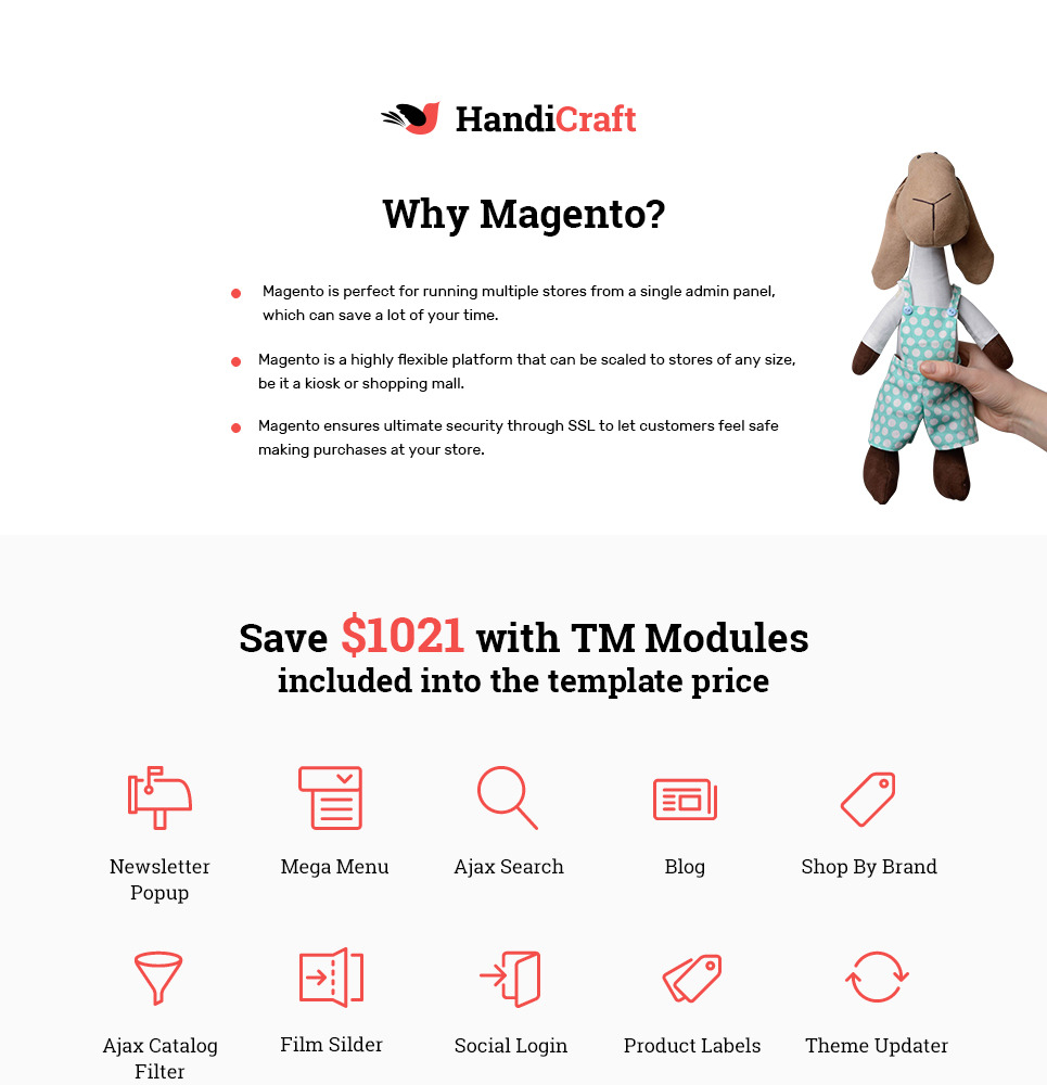 Ajax Catalog, Ajax Compare, Ajax Search, Ajax Wishlist, Blog, Featured Products, Film Slider, Google Map, MegaMenu, Newsletter popup, Shop by Brand, Site Maintenance, Smart Product Labels, Social Login, Social Sharing, Special Price Countdown, Theme Options |