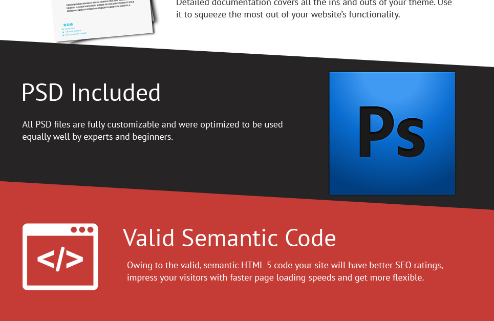 Admin Panel, Advanced Theme Options, Blog, Bootstrap, Dropdown Menu, Forum, Gallery, Google map, HTML 5, HTML plus JS, JQuery, Quickstart Package, Responsive, Sample content, Sliced PSD |