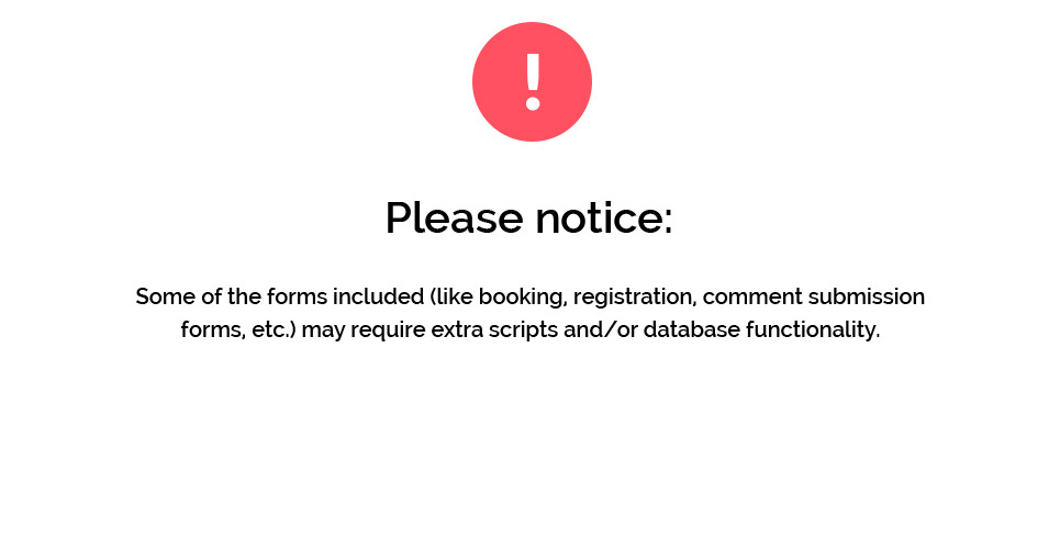 Some of the forms included (like booking, registration, comment submission forms, etc.) may require extra scripts and/or database functionality. |