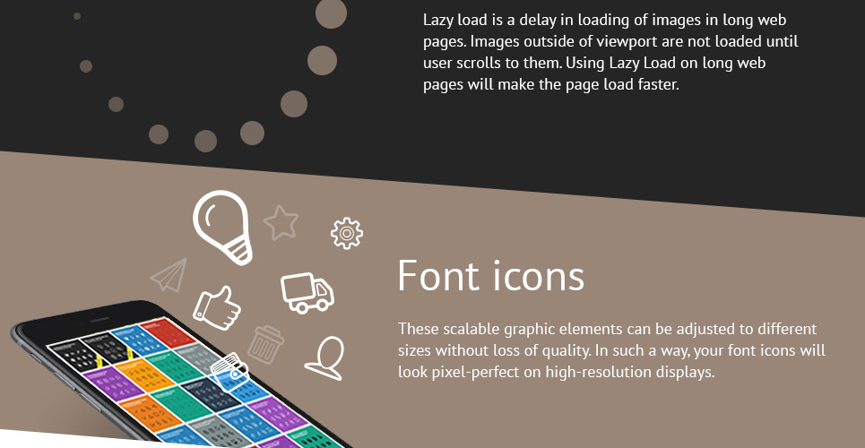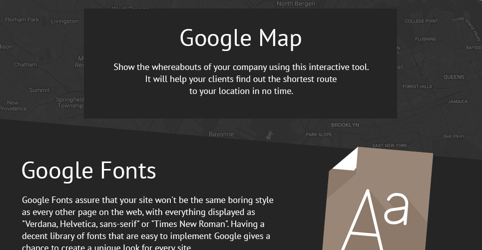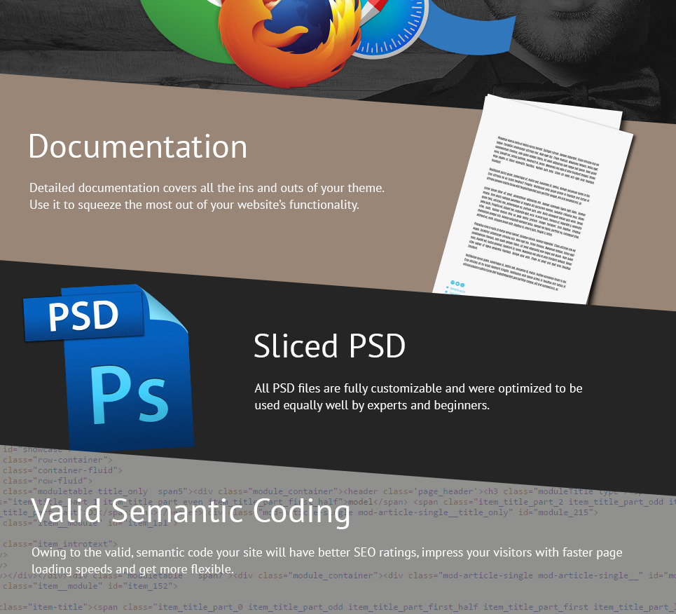 Admin Panel, Advanced Theme Options, Blog, Bootstrap, Dropdown Menu, Forum, Gallery, Google map, HTML 5, HTML plus JS, JQuery, Parallax, Quickstart Package, Responsive, Sample content, Sliced PSD, Tabs |