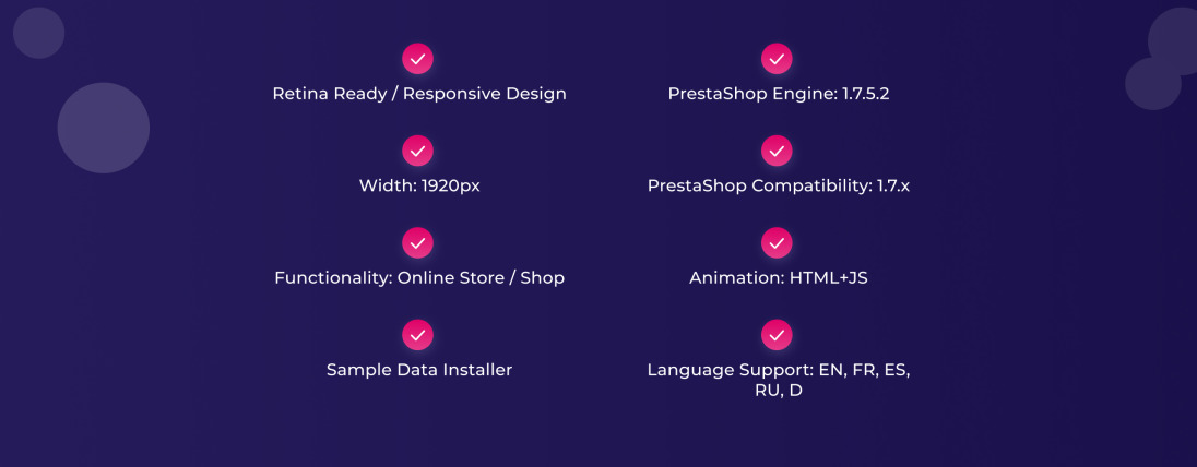 Accelerated Mobile Pages (AMP), Admin Panel, Blog, Bootstrap, Dropdown Menu, Google map, HTML 5, HTML plus JS, JQuery, MegaMenu, On-line chat, Online Store/Shop, Responsive, Sample content, Sliced PSD, Tabs |