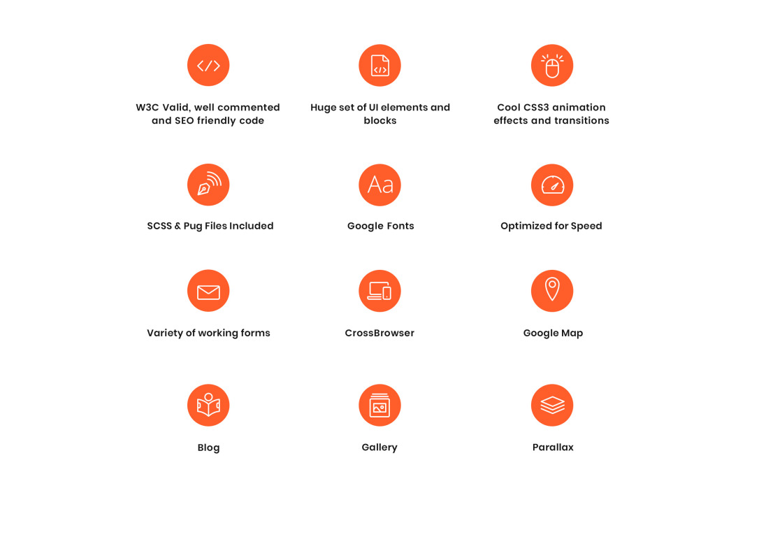 Bootstrap, Dropdown Menu, Gallery, Google map, HTML 5, HTML plus JS, JQuery, Parallax, Premium, Pro, Responsive, Search Engine Friendly, Tabs |