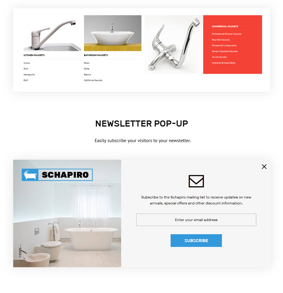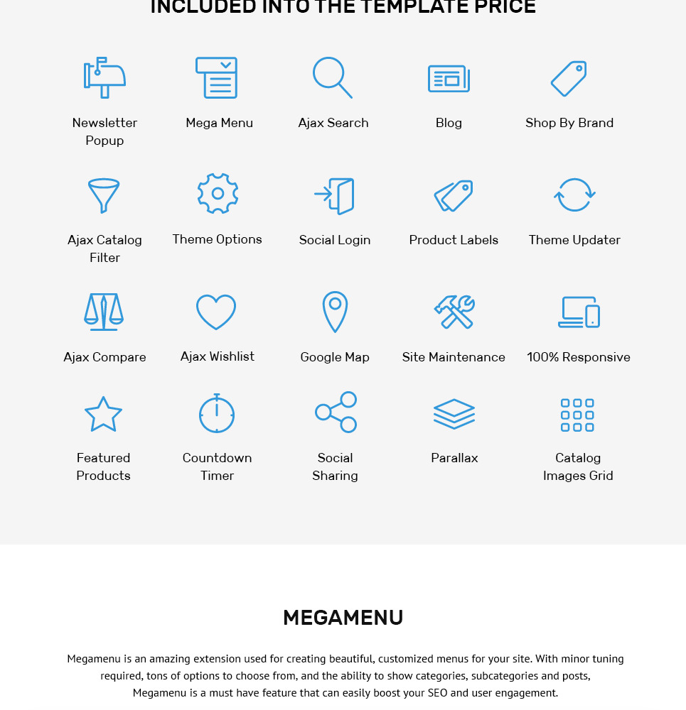 Ajax Catalog, Ajax Compare, Ajax Search, Ajax Wishlist, Featured Products, Film Slider, Google Map, MegaMenu, Newsletter popup, Parallax and Video Background, Shop by Brand, Site Maintenance, Social Sharing, Theme Options |