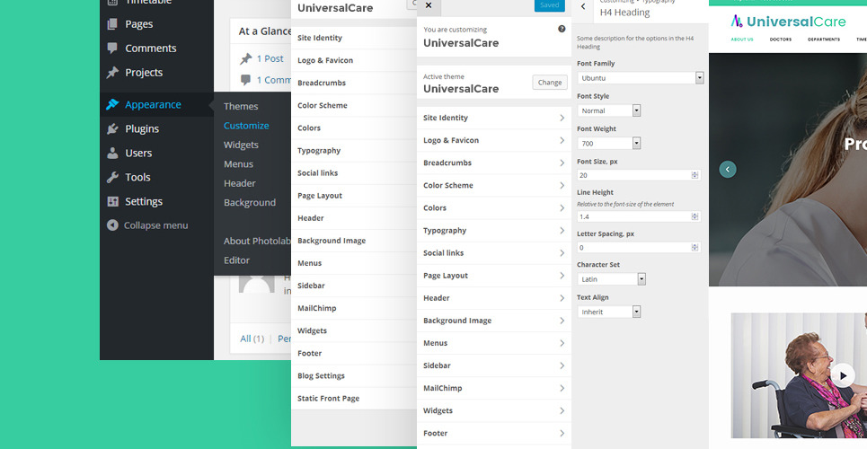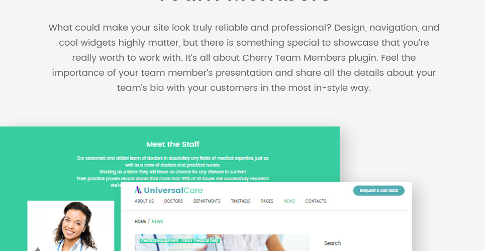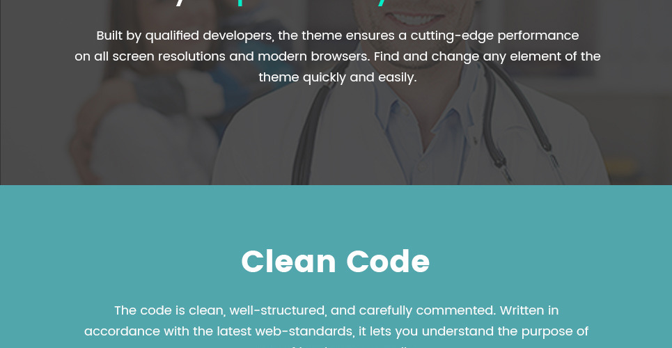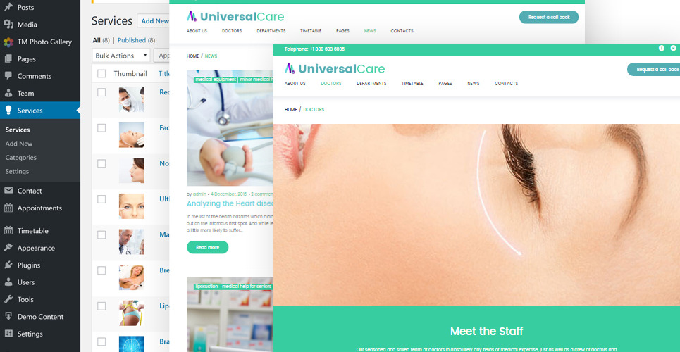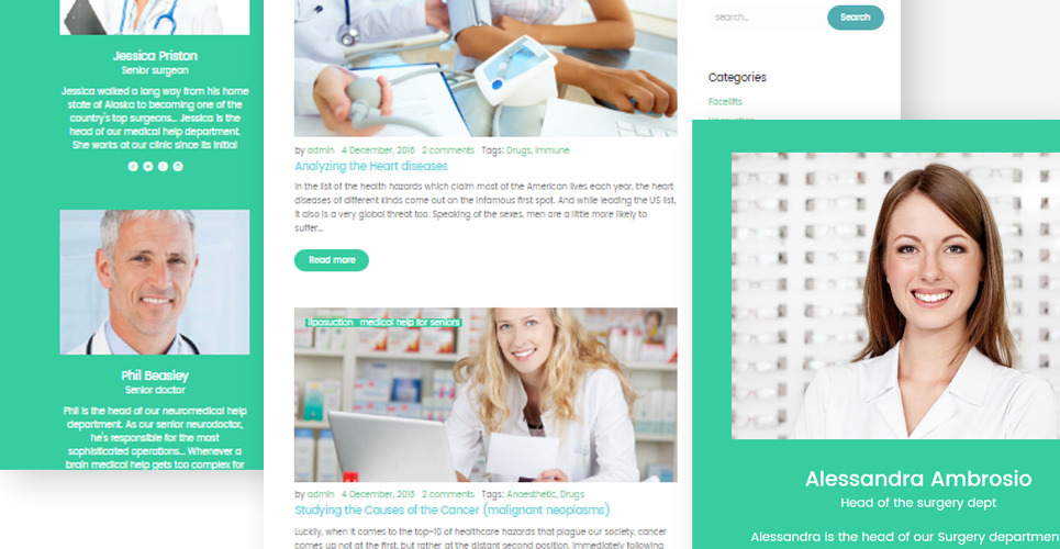 This theme is custom-made for medical, medical center, private clinic, reconstructive surgery, facelifts, pharmacy, nose jobs, gynecology, cancer care, health care, cardiovascular, pediatric care, and society & people websites. |