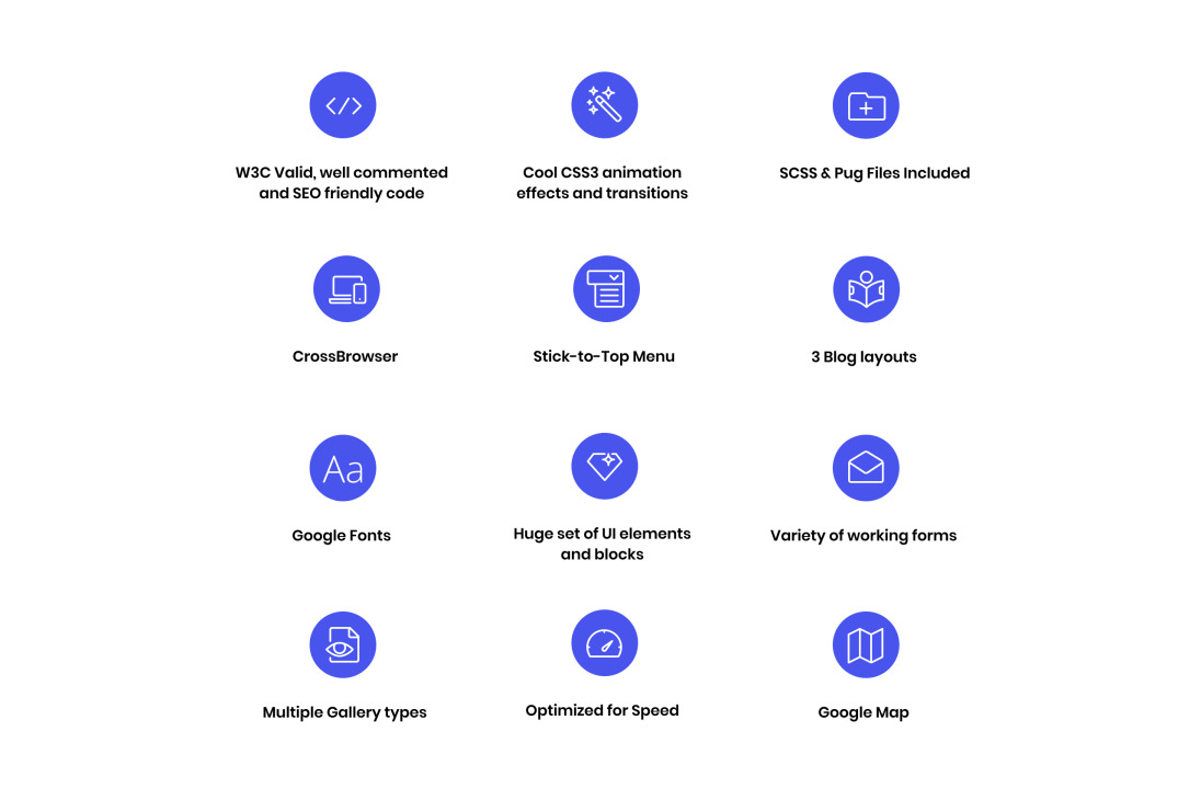 Bootstrap, Dropdown Menu, Gallery, Google map, HTML 5, HTML plus JS, JQuery, Parallax, Premium, Pro, Responsive, Search Engine Friendly, Sliced PSD, Tabs |