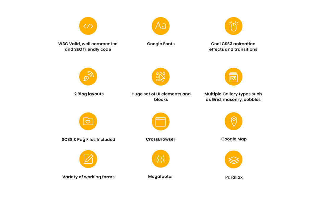 Bootstrap, Dropdown Menu, Gallery, Google map, HTML 5, HTML plus JS, JQuery, On-line chat, Parallax, Premium, Pro, Responsive, Search Engine Friendly, Sliced PSD, Tabs |